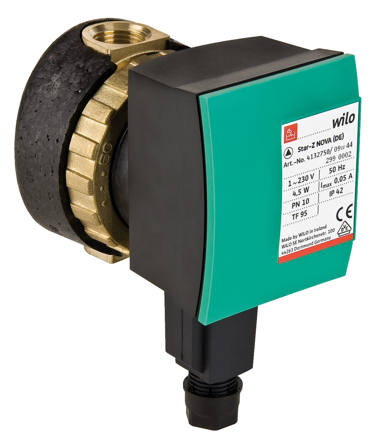 Natloper-circulatiepomp met draadaansluiting en blokkeerstroombestendig synchroonmotor.