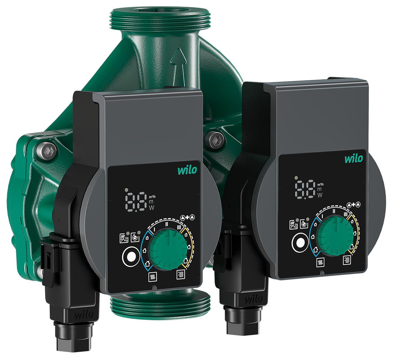 Glandless twin-head circulator with screwed connection, blocking-current proof EC motor and integrated electronic power control.
