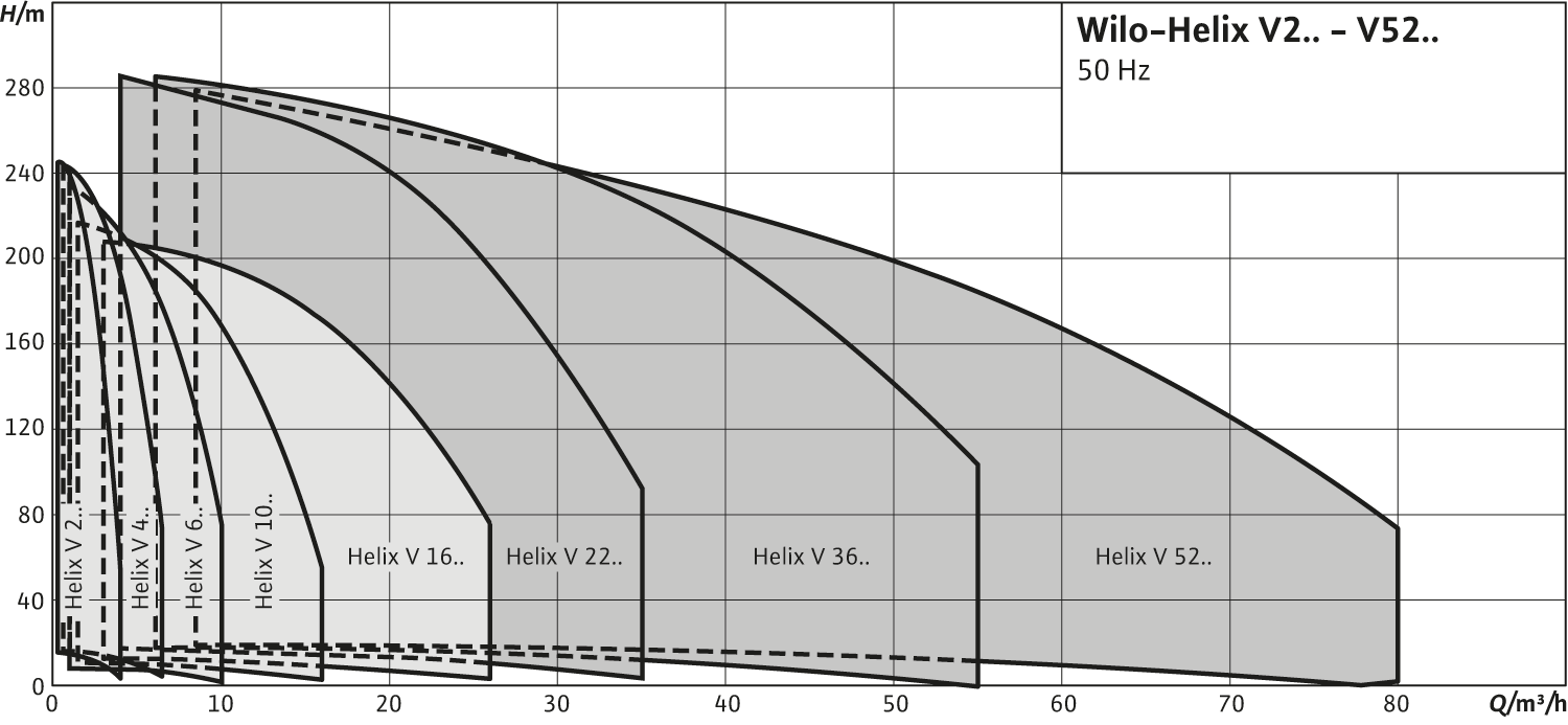 • Pomphuis: alle onderdelen die met vloeistof in contact komen zijn van gegoten roestvrij staal 1.4409 (AISI 316L); losse flenzen van gietijzer met KTL-coating EN-GJL 250 voor Helix V 22/EN-GJS 400 voor Helix V 36-52.