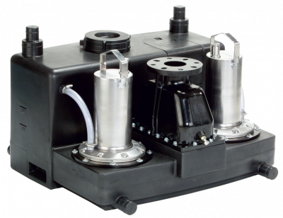 Compacte, stekkerklare en volledig overstroombare dubbelpomp-opvoerinstallatie voor het transport van fecaliënhoudend afvalwater.